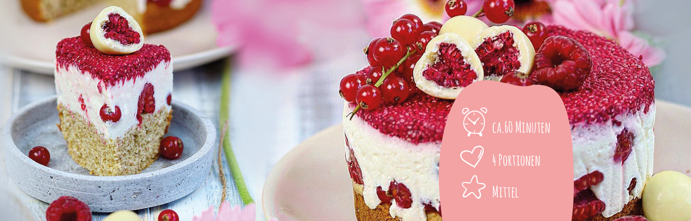 100 ml Wasser mit 4 TL Himbeerpulver vermischen – dazu 25 g weiße Chia-Samen dazumischen und als Decke auf die Creme geben.