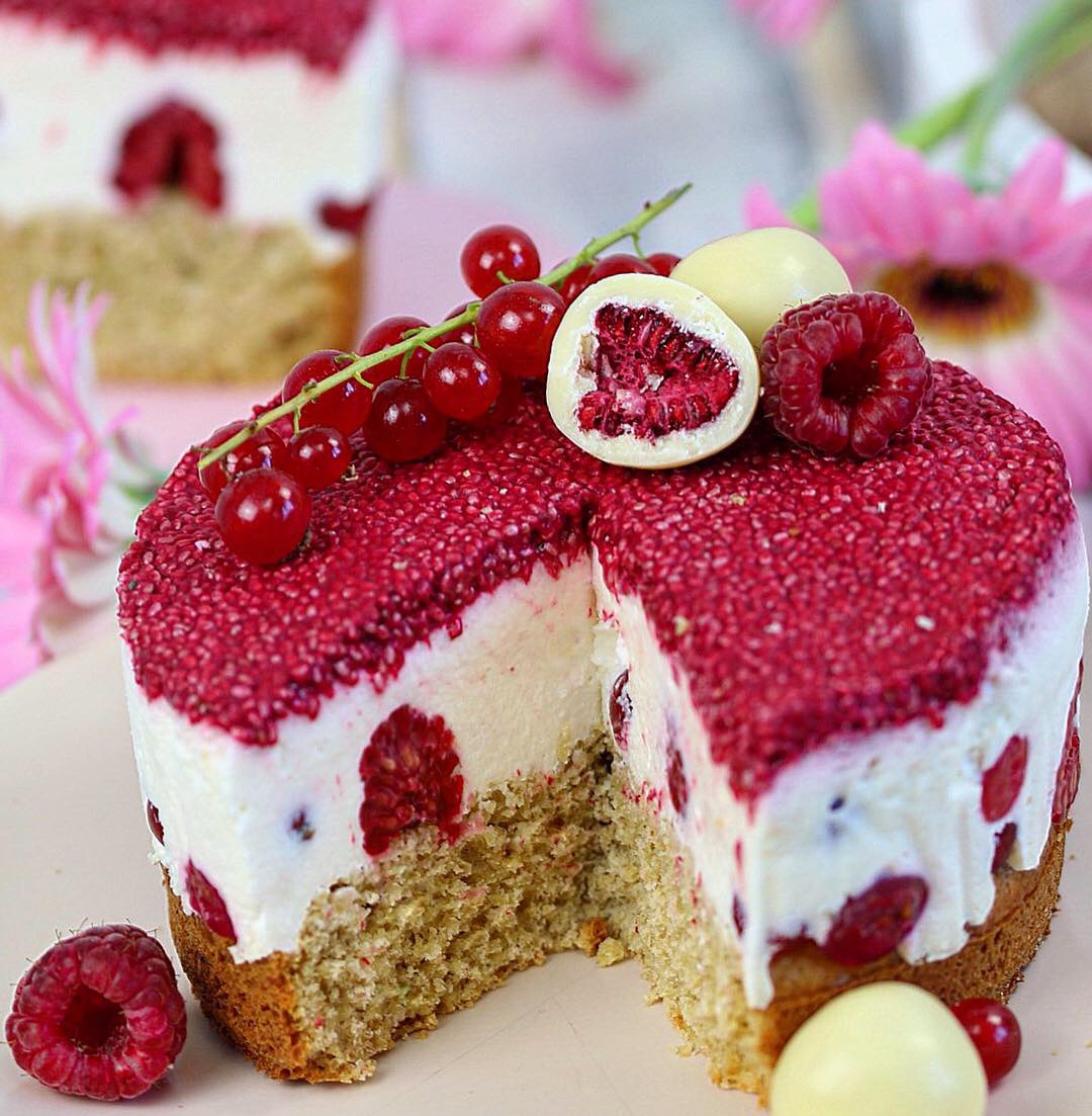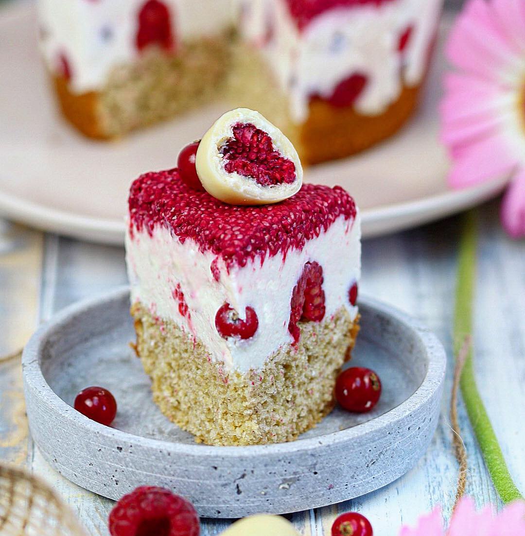 Kurz vor dem Servieren haben wir die Torte mit frischen Beeren und Himbeeren in weißer Schokolade getoppt. Das macht optisch richtig was her.