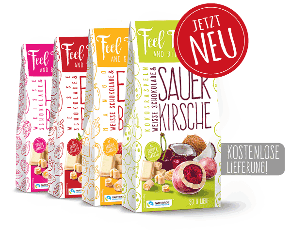 Alle Früchte werden für Feel Fruity von Hand geerntet. Durch eine sorgfältige Sortierung schaffen es nur die besten Früchte in die Feel Fruity Produkte. Das schonende Verfahren der Gefriertrocknung erhält nahezu alle Aromen und Vitamine in den Früchten. Mit feinster Schokolade umhüllt, entsteht aus den Früchten das einzigartige Feel Fruity Geschmackserlebnis.